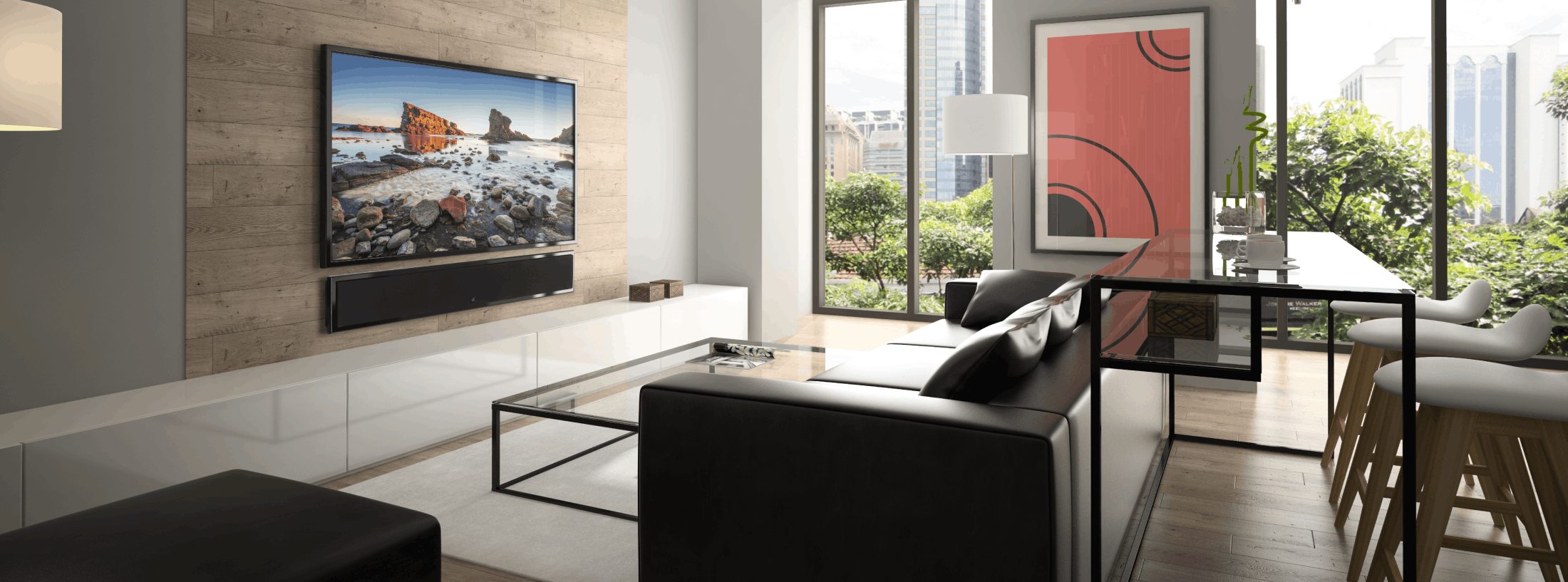 All this, packaged in an ultra-slim, 3-channel soundbar design for super-thin TVs, giving you a complete stereo and center soundstage.